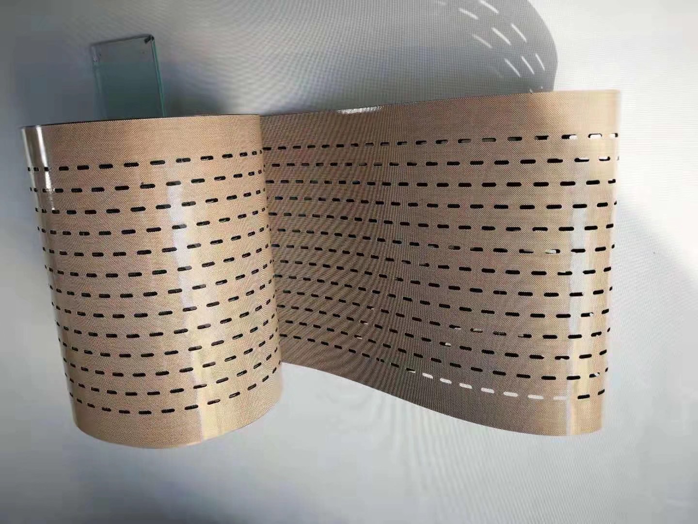 4、特氟龍輸送帶尺寸穩(wěn)定性好(延伸系數(shù)小于5‰)、強度高。具有良好的機械特性。